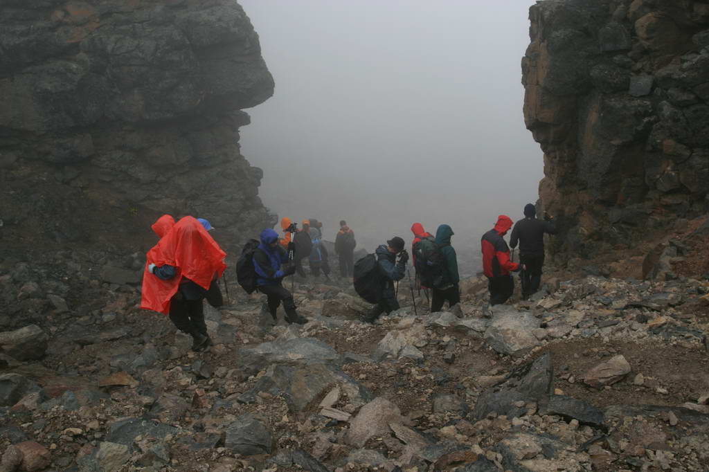 We got more spaced out, with the front people going down quickly and some of us going down more slowly. For rather a while, I was walking by myself, as I could not see anyone (in the fog/cloud) ahead of me or behind me.