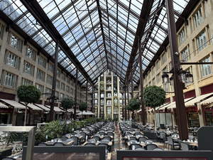 Amy wanted to check out the area, and in particular a chocolate museum, so we left the group and headed up the shoreline. We ran into an interesting hotel, where there was a very large main lobby/atrium, that was set up to look sort of like a quaint street, with the two rows of rooms/shops looking like buildings/store-fronts along the street.
