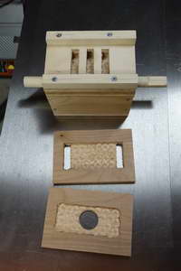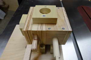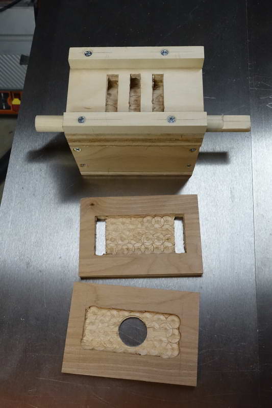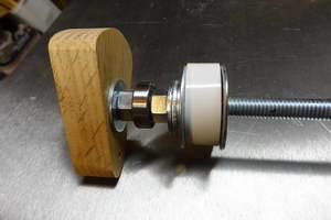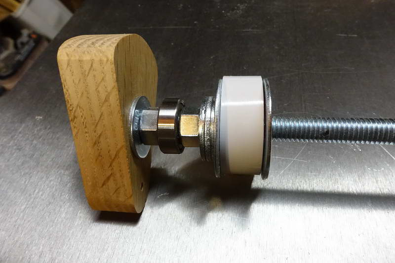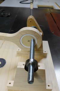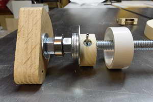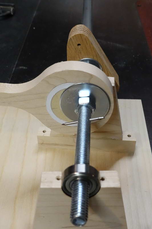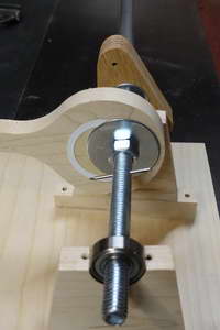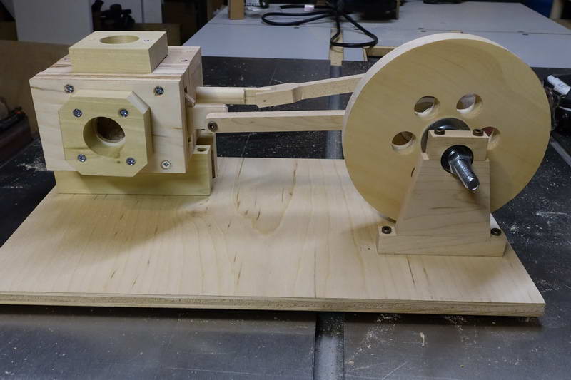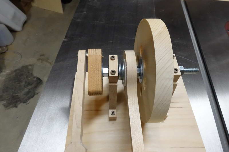 The main “non-woodenness” of it is that I used a bolt for the axle rather than a dowel, and a pair of bearings to allow the bolt to rotate. It was not feasible to offset the axle as in Matthias’s design, so I used a more normal eccentric.