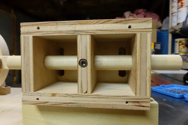 Then I assembled onto the axle the crank, bearing, and eccentric. I carefully oriented the eccentric to be 90-degrees from the crank, and then I tightened the nut down on it. Once it was held in the proper orientation, the hole in the axle was visible in the radial hole I had drilled into the wooden blank. I used that hole as a guide to drill a hole through the bolt and into the center of the blank. I could then slide a brad into that hole, which would keep the eccentric from twisting on the axle. The PVC cylinder would keep the nail from falling out.