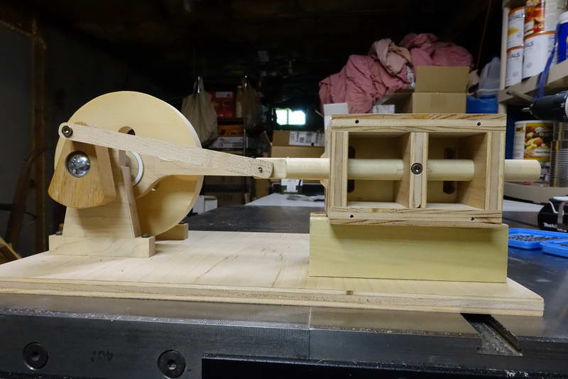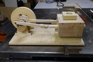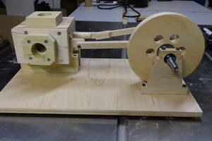 After thinking about it for years, I finally built a (mostly) wooden “Steam” Engine. It actually runs off air (either blown as from a hair drier, or sucked as from a shop vac), so it should more correctly be called a pneumatic engine, but it illustrates the same principles as a steam engine. Steam would be a bad idea here, as the moisture would make the wood swell, and bad things would happen.