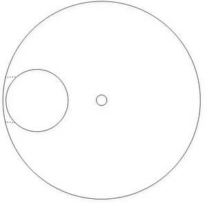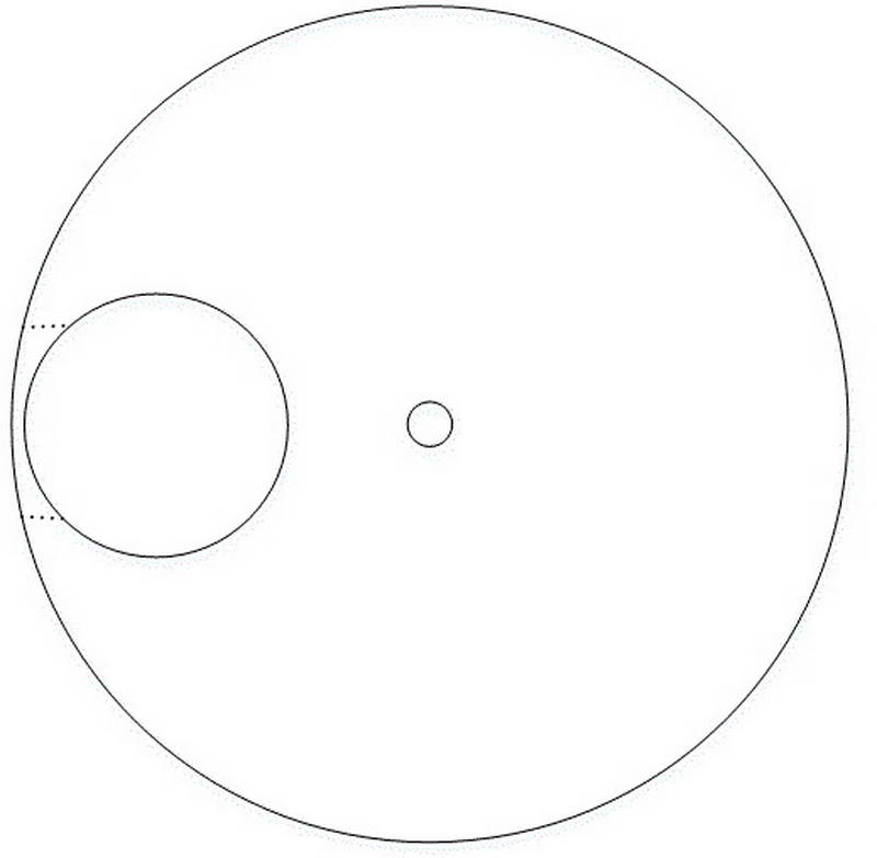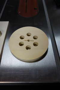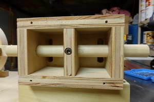 To make the eccentric, I laid out a circle on a wooden blank the same size as the inside of the PVC. I located the center of this circle and the offset circle for the axle. I drilled a small hole at the center and the appropriately-sized hole (3/8”) for the axle. I then drilled a quarter-inch hole radially from the outside into the axle hole (see the drawing below). I’ll say what this hole was for shortly.