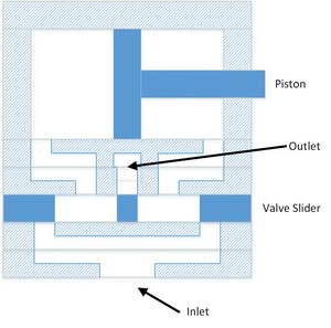 When the valve slider moves to the left, air is directed from the inlet to the left side of the piston, pushing the piston to the right, and the air to the right of the piston is directed out the outlet. When the slider moves to the right, things are reversed: