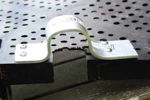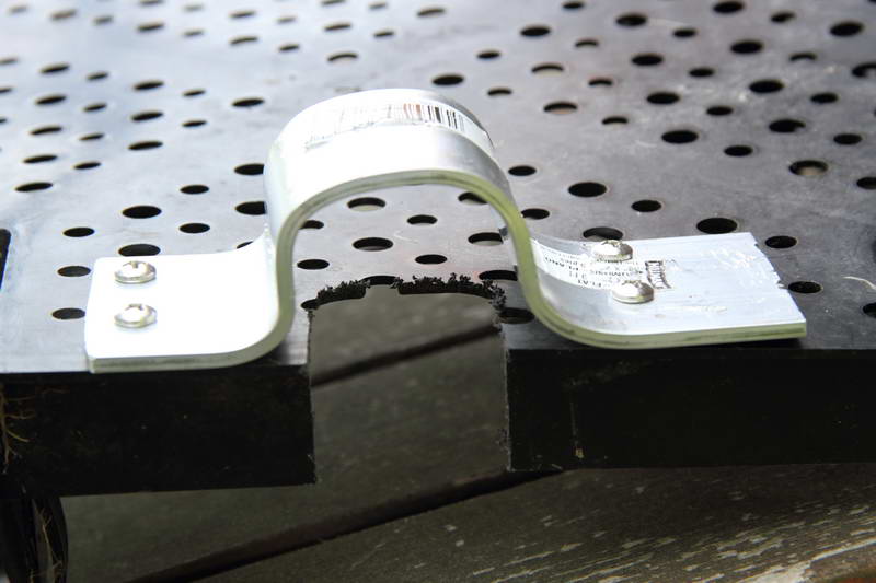 This "hood" over the notch needed to be made of some material that wouldn't rust. I got a strip of 2-inch 1/8-inch thick aluminum at my local big box hardware store. It would have been trivial to bend it up with a sheet-metal brake, but of course I don't have one. I had to make due with a vice, some pliers, and a big hammer. The brackets I made weren't very pretty, but they should be functional. I attached them with stainless steel fasteners.