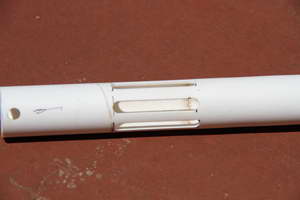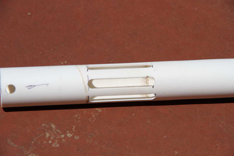 This time, I ordered a 7/8 inch UHMW plastic "dowel". In theory, this should not swell, and so it should not get jammed in the tube. I also cut four slots the length of the plastic, to provide vents, so that I wouldn't get an air pocket forming. This resulted in: