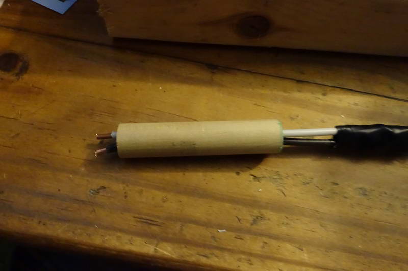 Plan-B was to use Romex house wiring cable. This was solid copper, and it didn't seem to corrode when I did my tests earlier. So I just cut a short length of it and soldered it to the end of the wires.
