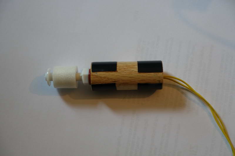 I had made sure that the dowel/tape was just about equal in size to the tube, so that the float switch would be well centered. It was a somewhat snug fit. However, being in a damp environment, despite the polyurethane, the wooden dowels absorbed water and swelled. The net result was that it was utterly impossible to move the dowels, even with the set screw removed.