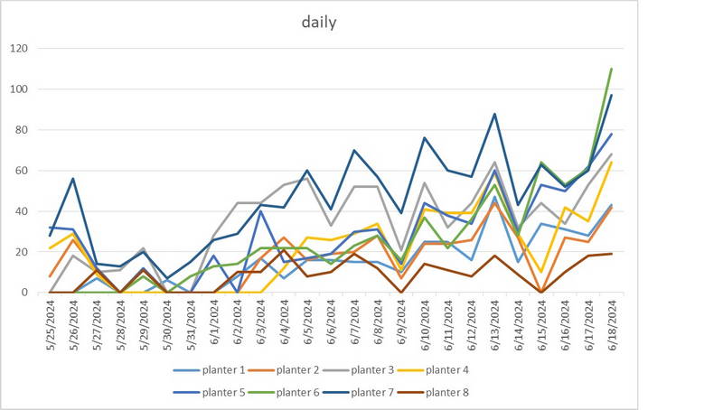 This is a problem because when the planters overflow, they end up leaching the fertilizer out of the planters, and the plants suffer.
