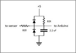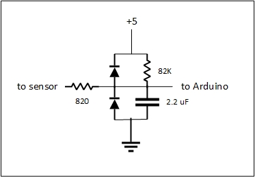 However, my discrete components mushroomed on the input side. Originally, I was just going to use a single pull-up resistor per input, but then I figured that I should probably add some ESD protection (particularly as I use an electric fence to keep out pests, and the fence uses pulses of high voltage). This added two clamp diodes to each input. Finally, I added a capacitor and resistor to each input to low-pass filter it. My thought was that if there was a high-voltage spike on an input wire, the voltage on the capacitor would rise relatively slowly and give the diodes more time to bleed away charge.