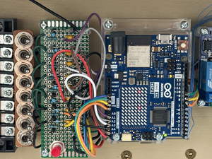 I debated whether to try to make a custom circuit board for the front end. I've never done this before, and I thought that it might be a good excuse to learn how. But in the end, I just used a perf board and point-to-point wiring. Here is the bulk of the new design. The new board on the left (next to the column of switches), and the new Arduino on the right.