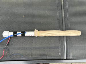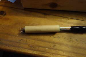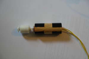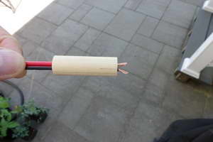 For the probes, I wanted something that I could embed inside a ½ inch PVC tube, so that I could put one down the watering tube, but so that I could easily remove it if it needed adjusting. Initially, I just pushed the end of the wire through a dowel with a snug hole through it