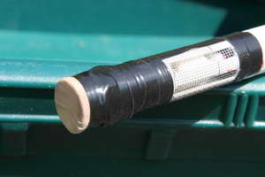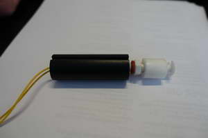 To mount the switches, I cut off some pieces of 7/8-inch dowel, and then drill and tapped a hole down the center. I polyurethaned it in an attempt to keep the water away from the wood. This was slightly loose in the tube, so put a layer or two of electrical tape around the ends to make them thicker. The net result was this: