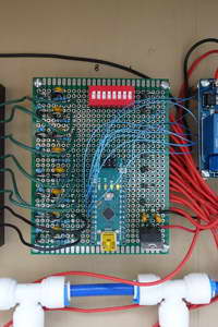 The center is the Arduino Nano. The left side is the input circuitry: the ESD and pull-ups that I described earlier. The right side are the fly-back diodes and a voltage regulator. At the top is a DIP switch that shorts the input the ground. This is used to enable/disable a particular planter. When the switch shorts the input to ground, it looks like that sensor is “wet”, and so the valve is never energized.