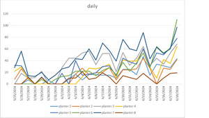 For simplicity, the Wifi connection uses UDP packets. I structured it to respond to requests. That is, periodically, it checks to see if there were any incoming UDP packets on a particular port. If there is, it responds to that IP address with a UDP packet containing the values of counters. These count how many seconds each channel's solenoid valve was open. I then wrote a perl script to periodically poll the system to retrieve the counters. This allows me to capture the data into a file and to create graphs like: