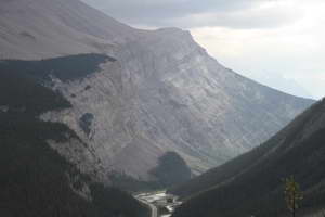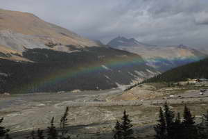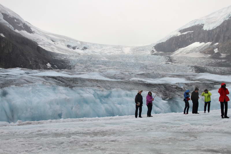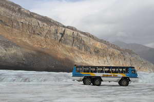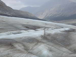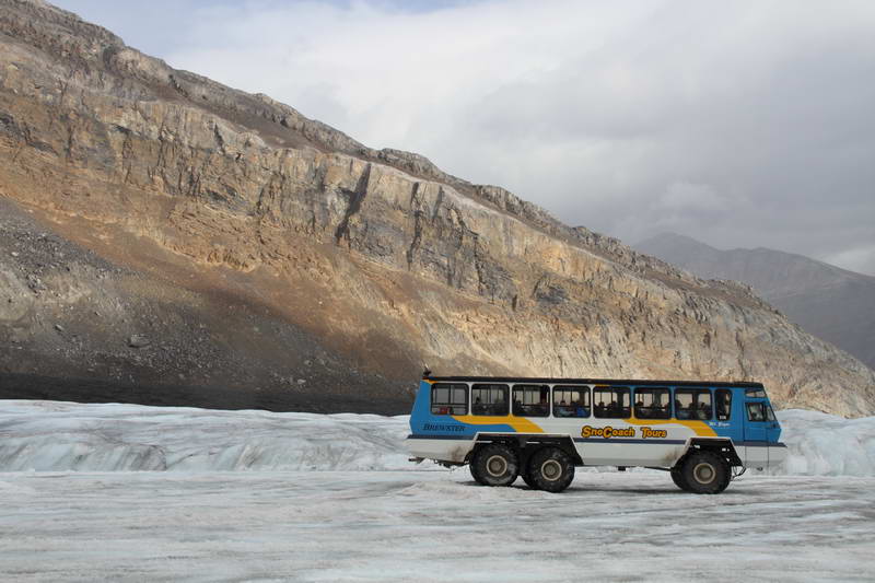 We were surprised to be boarding a regular tour bus rather than the fancy snow coaches (called something like “terra-bus” as in “Ivan the terra bus”), but then we realized that the buses take us across the street to the edge of the glacier, and the snow coaches take us from there. (Apparently they built 23 of them. 22 of them are in Jasper, and the 23rd is in Antarctica.)