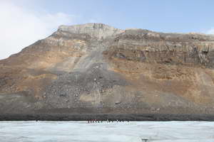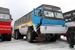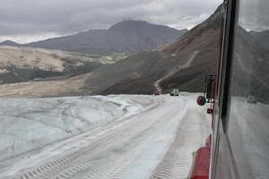 The vehicles just drove slowly along a road graded into the top of the moraine, down a steep section onto the ice, and then up the ice to a big cleared spot. There we could get out and walk around. Of course, other than the “gee whiz” effect of standing on a glacier, it was no different from standing in a frozen parking lot in the middle of winter.