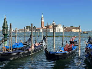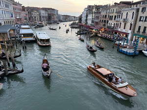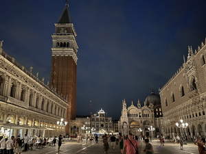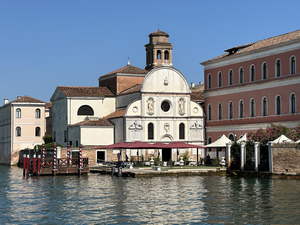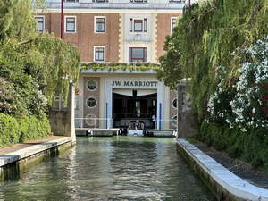 We had about a 45 minute cruise to the island. Then we got a welcome spiel, checked in with the hotel, got our door cards, and got inside. We were planning to just get settled and then head over to Venice, but before we could leave, our luggage showed up. I changed from jeans and a cotton tee-shirt to shorts and a synthetic tee-shirt. It was probably around 5 when we took the hotel shuttle (boat) to Venice.