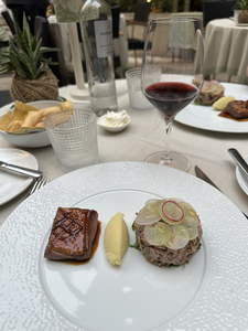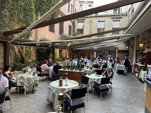 We took a half hour gondola ride, then we found a restaurant that seemed good, so we had dinner there. They had a courtyard where you could eat. There was netting overhead to keep the birds away, and some interesting rolled up awnings for when it was sunny.