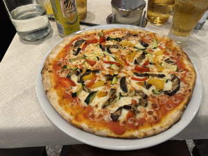 We walked semi-directly to the Rialto bridge. We needed to eat, and it was hot and we wanted to cool off, so we found a small place and had lunch. I got a pizza, and Amy got Tortellini.