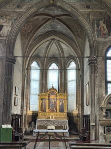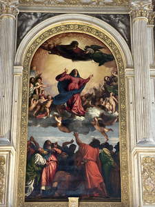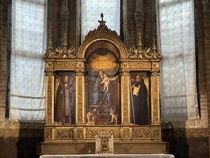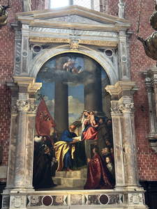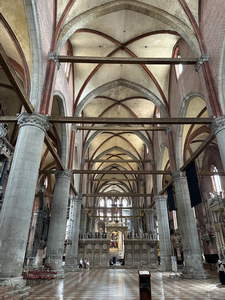 After lunch (now around 3:30), we followed Rick Steve’s suggested walk from the bridge to the Frari Church. We paid a small fee to get in, and then took a bazillion more pictures. There were some very large monuments in the sides of the church. We spent about 4:30 to 5:30 there.