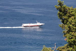 I found one store there that had stuffed animals, but they had very few bears, and none came close to interesting me. I did, as I had planned, stop at one place and get some ice cream. I successfully found my way back to the old fort about 5 minutes before the shuttle bus was scheduled. It arrived, as promised, and I rode it back to the pier. We passed by some ornate building, but by the time I got my phone camera out, we were passed it.