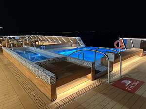 I was a bit thirsty. I wouldn’t have minded a bit of dessert, but for once, I couldn’t find appropriate food on the ship. I went up to the cafe and made some chamomile tea, then went out on the Aquavit Terrace (stern of the ship next to the infinity pool) to drink it.
