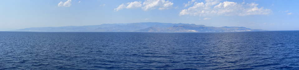 We are cruising SW along the base of the Italian “boot”. It is a bit hazy in the distance. We can see a hazy outline of mountains toward our starboard side, but it is more like a dark smudge.